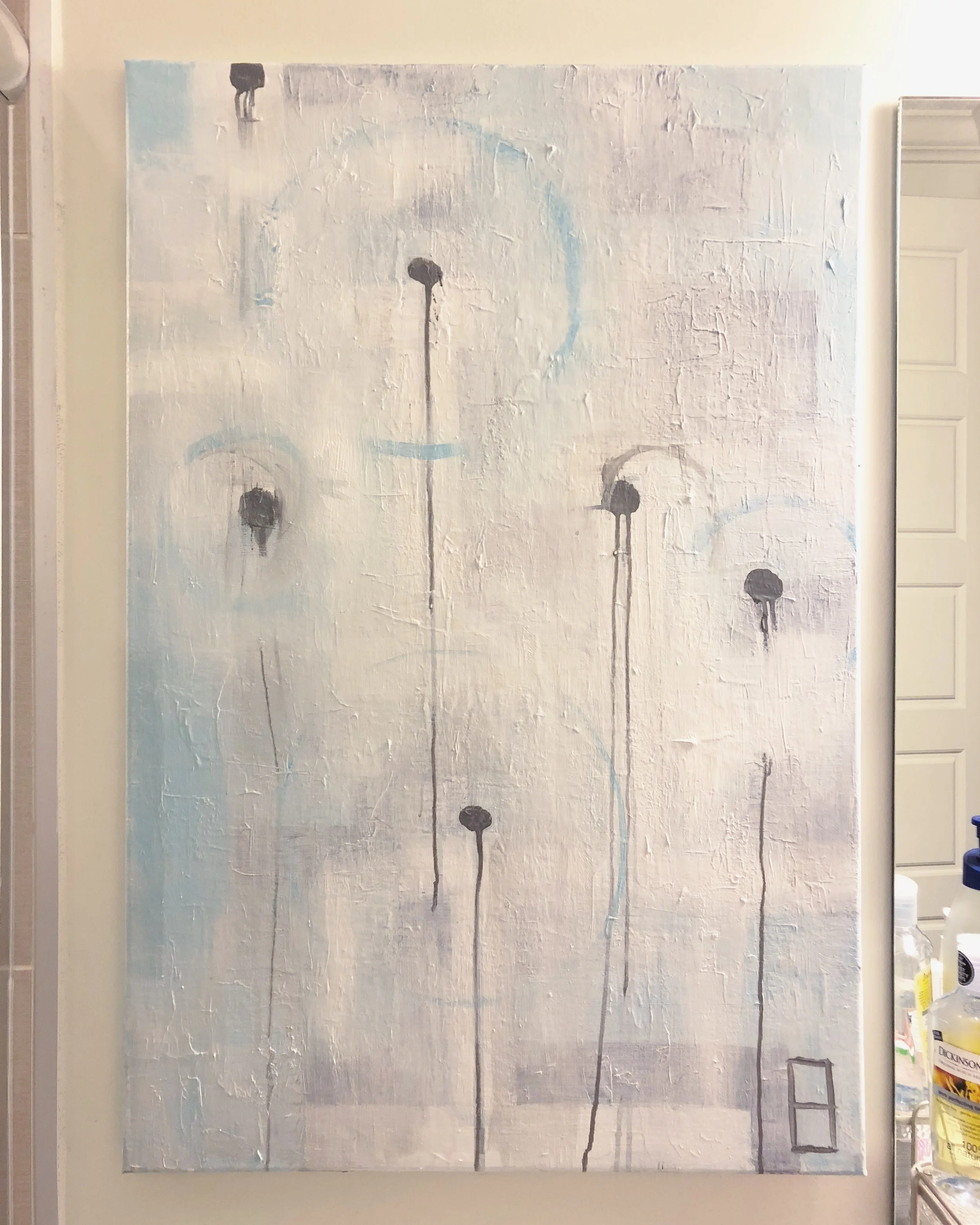 This acrylic painting was commissioned by my roommate and myself for our bathroom. We wanted a very light painting that would add to the space but not be a focal point or distraction. I worked with hues of blues, grays, and whites. This painting was a very long process of layering paintings on top of each other to create the final product.